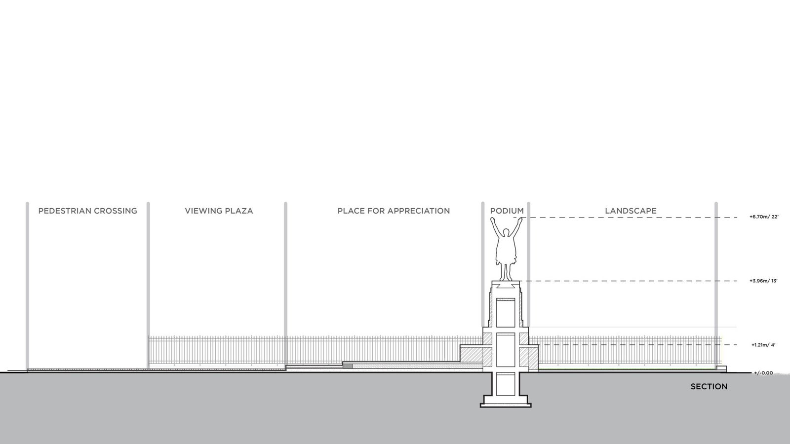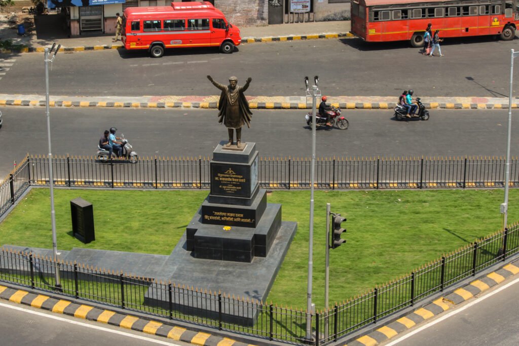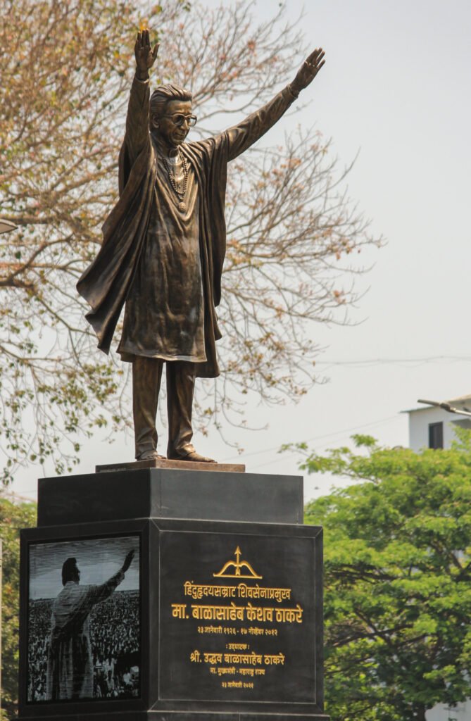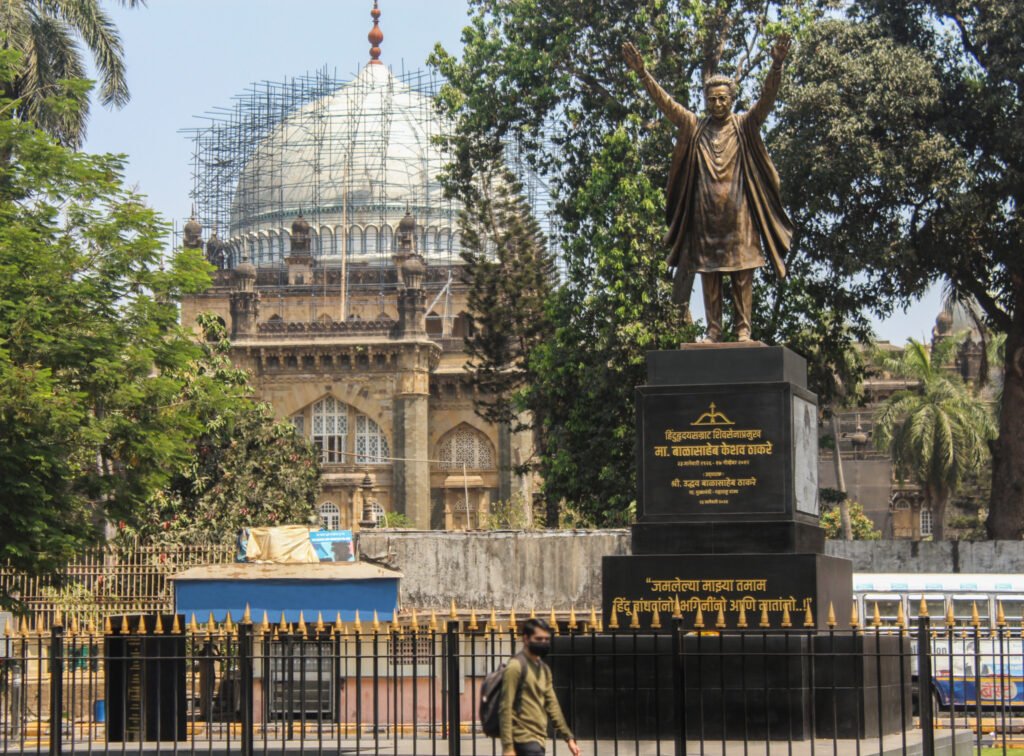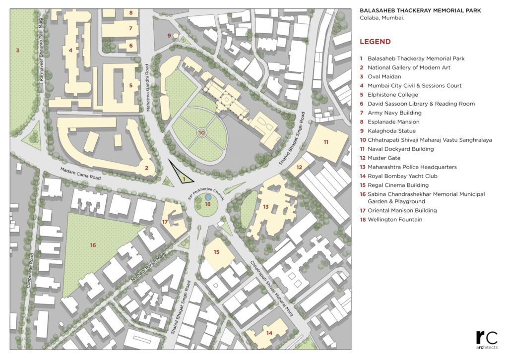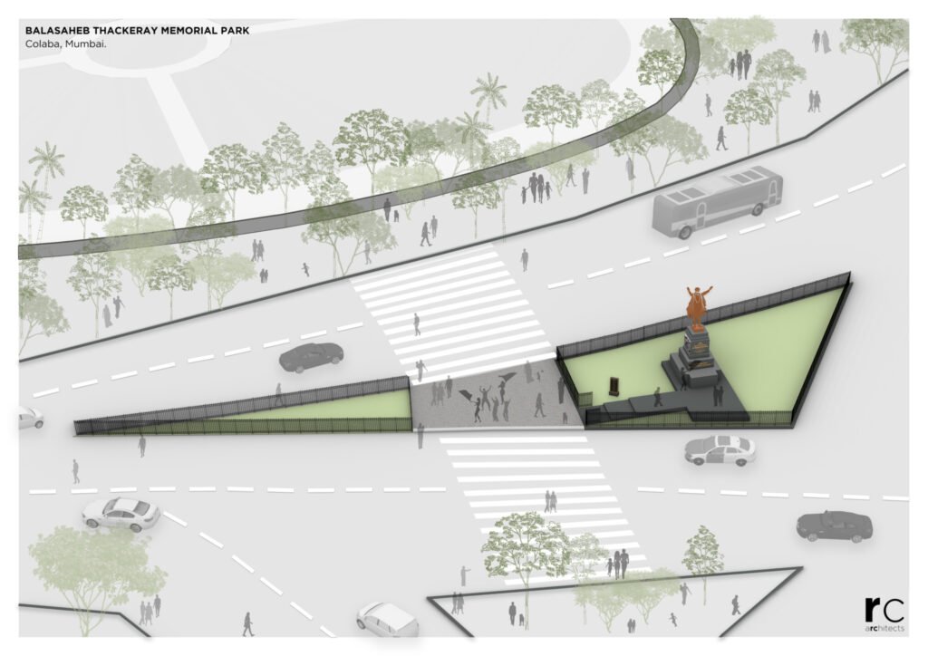 Balasaheb Thackeray Smruti Udyan is located on a triangular green patch in front of the National Gallery of Modern Art and Chattrapati Shivaji Maharaj Vastu Sangrahalaya. The triangle is divided into three parts; the first is a green triangle. The second part is a crossover pedestrian plaza, and the third part is a garden for the statue and the pedestal. The pedestal is designed as an arrangement of five platforms in layers, starting from the bottom as