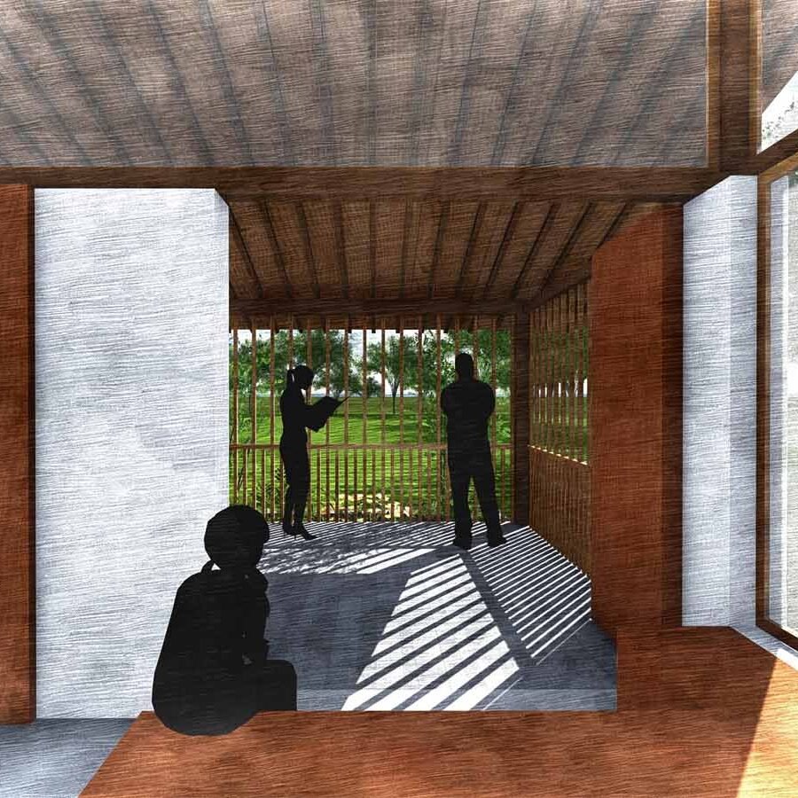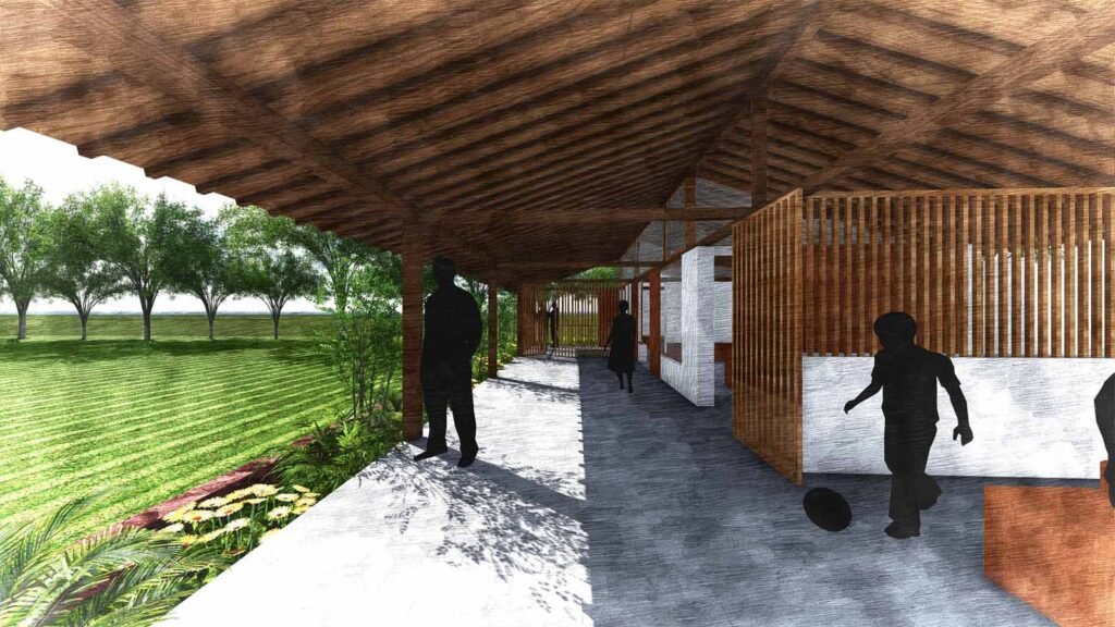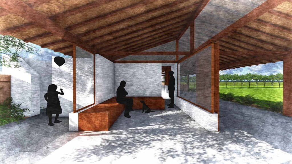 Both the open verandah and the enclosed spaces are unified under a continuous sloping roof, creating a cohesive architectural form that responds naturally to the rural setting while offering shade, shelter, and a sense of warmth.