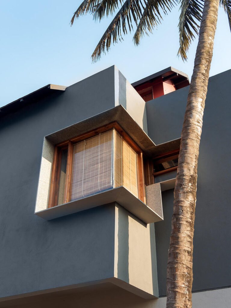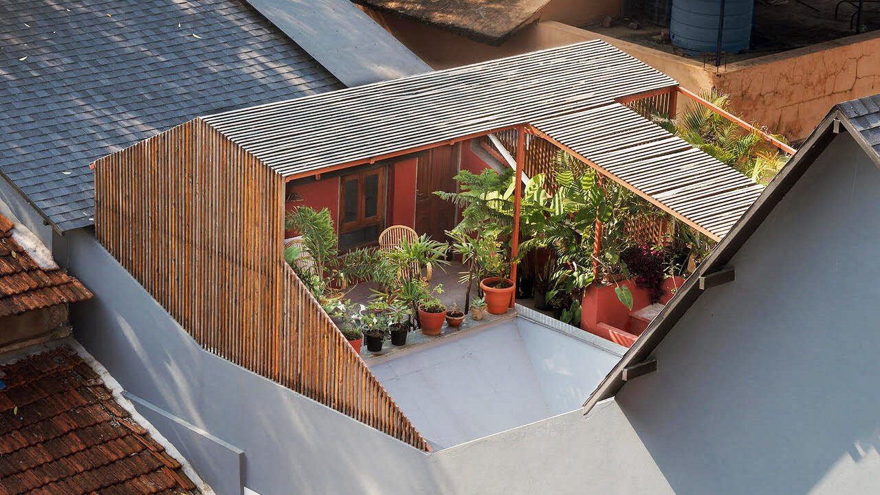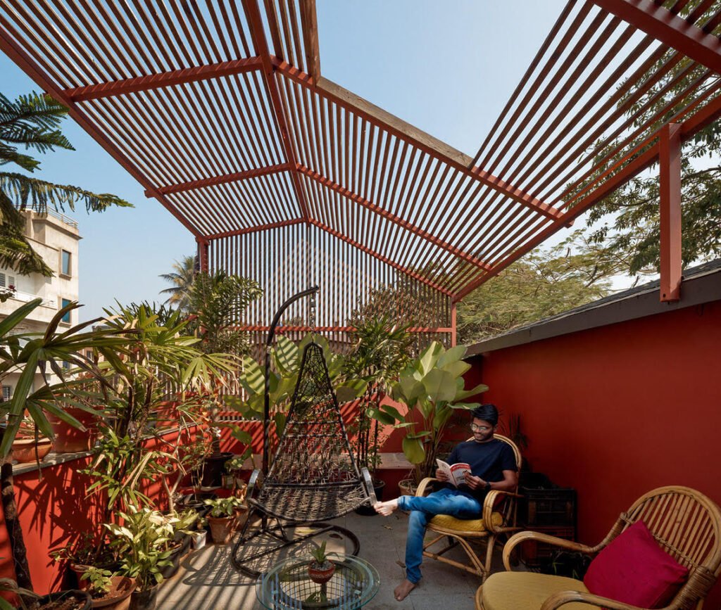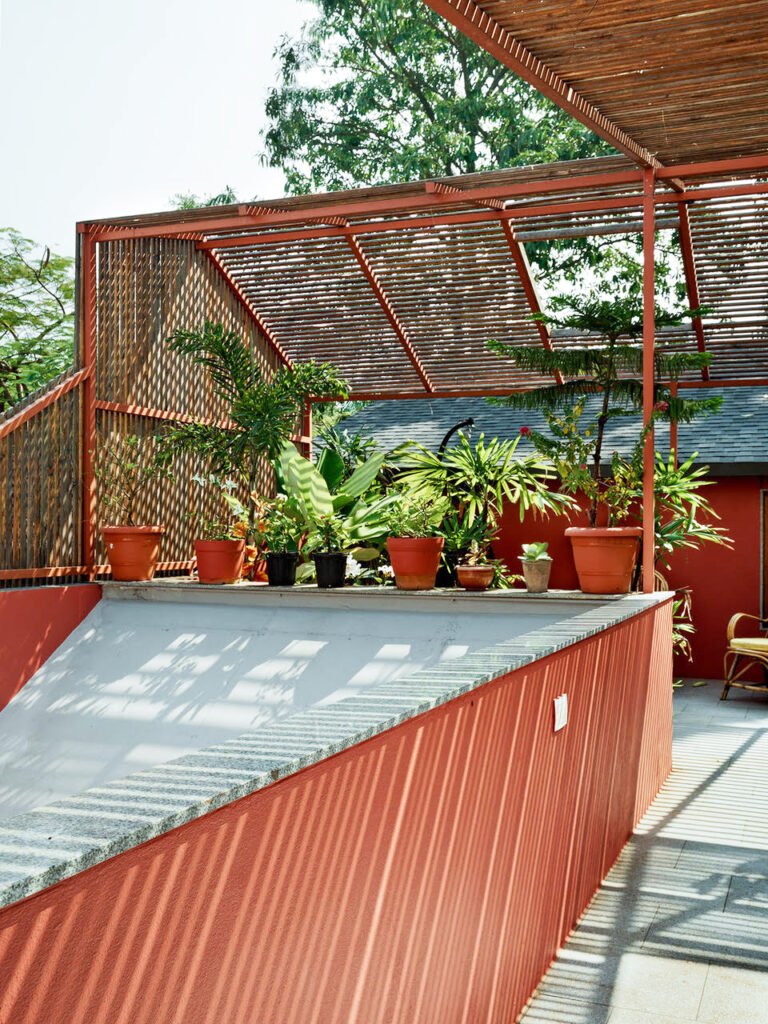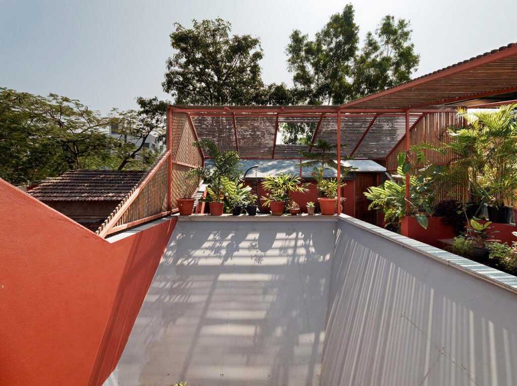 The first floor consists of two bedrooms connected by a common terrace. The common terrace starts as a semi-covered space topped by a pinewood lattice cover, creating an intriguing volume where users can sit together along the benches or use it as a space for congregation. This space is followed by an open-to-sky terrace, lined with planters and overlooking the garden on the ground floor. Considering the harsh direct sunlight that the terrace receives, the walls of the terrace are painted tan red to minimize glare and make it a comfortable space to inhabit.
