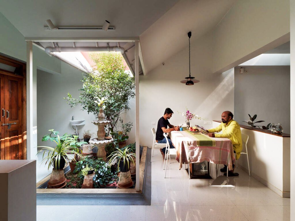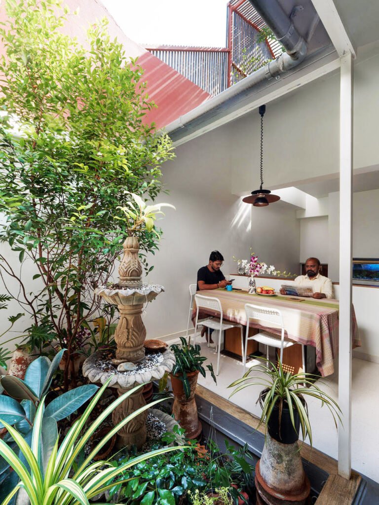 The common garden is surrounded by the living room, the kitchen, and the bedroom, and is utilized for various activities throughout the day. It also plays a very important role in providing abundant light and ventilation for the entire house. The bedroom, with its private toilet, has openings on opposite walls facilitating cross ventilation and opens into a private garden.