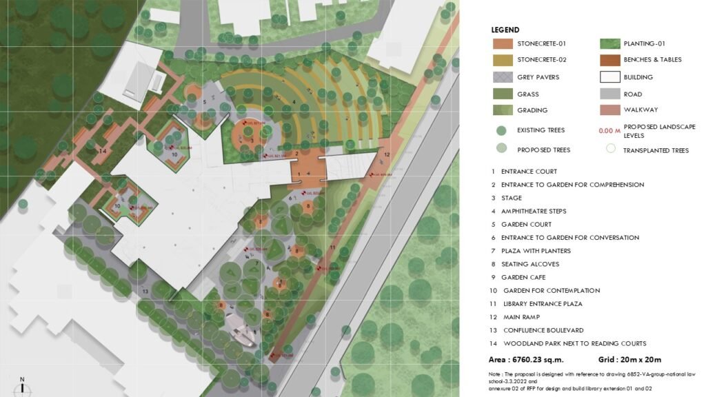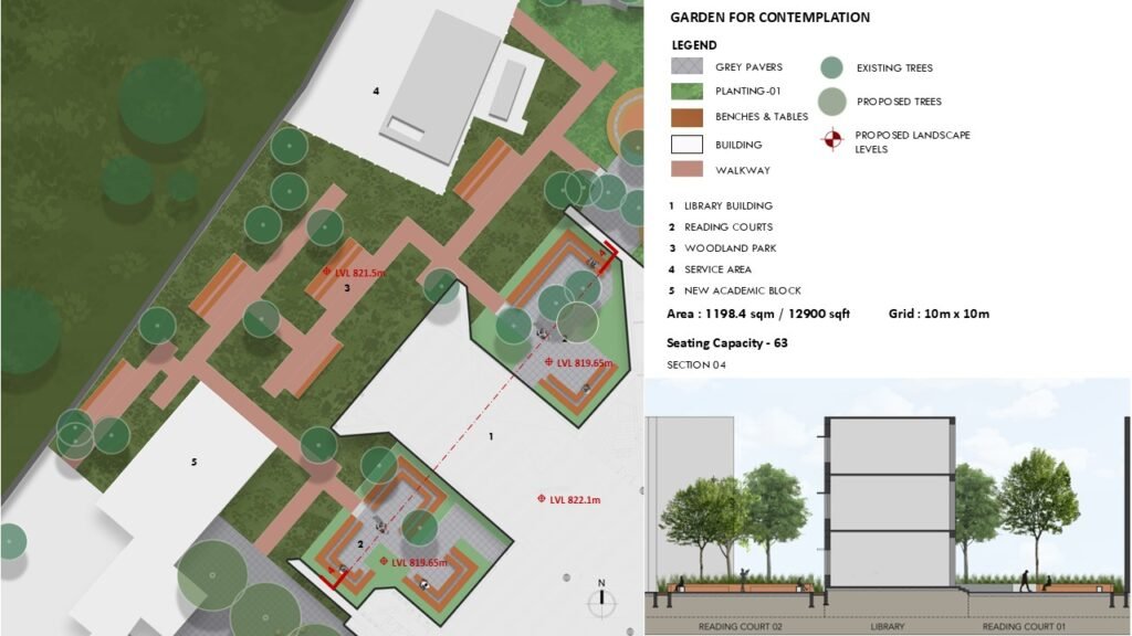 Adhering to the proposed landscape strategy, the landscape for the library responds to the library building in addition to incorporating the wild character of the existing landscape on campus. The design is envisioned to create an assembly of gardens that create a generous number of outdoor spaces for informal activities and are classified as follows,