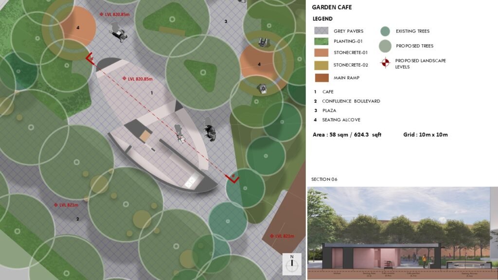 - Garden café – A café designed as a pavilion placed in the assembly of gardens around the library