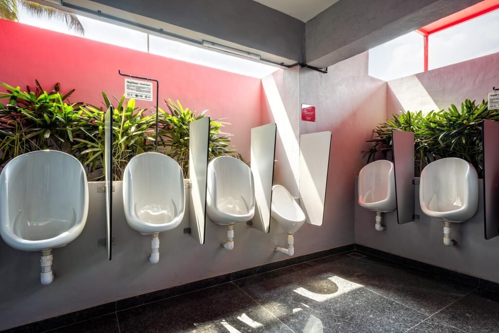 To the right, a passage leads into the men’s zone, which comprises a wash basin area, four toilet cubicles, and eight urinals, including one designed specifically for children.