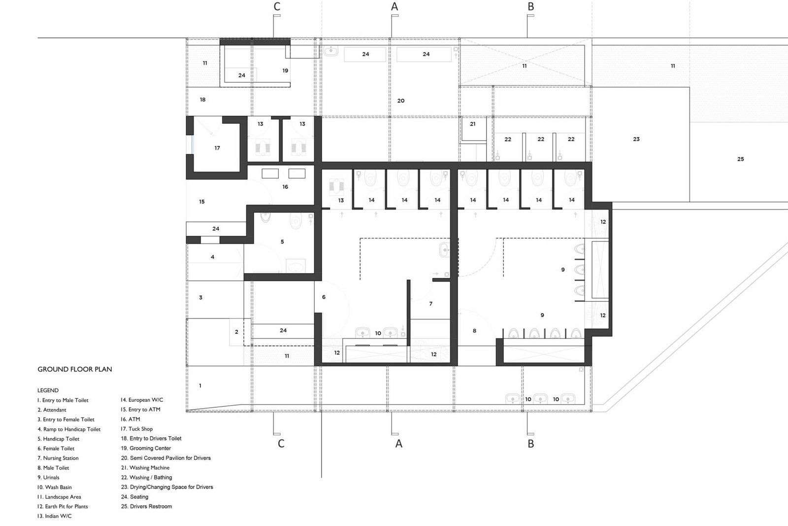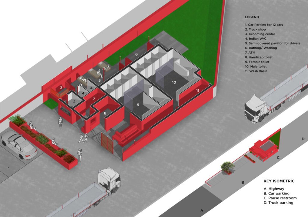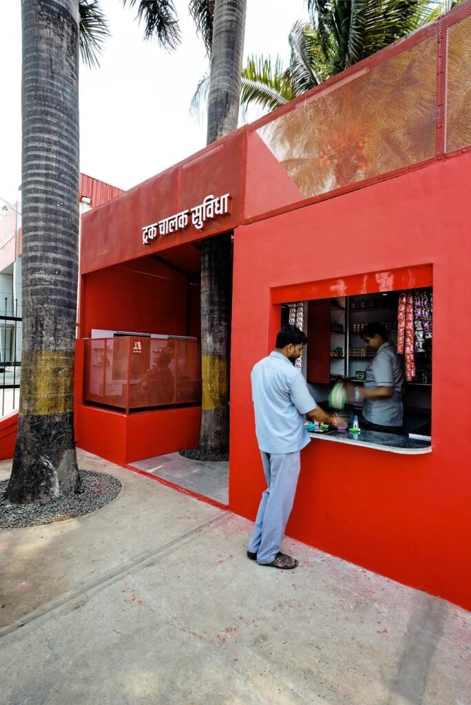 At the center of the front façade is the Suvidha Kendra, a convenience center for truck drivers equipped with banking and transaction facilities. The truck drivers’ section is located at the extreme left and includes amenities such as a tuck shop, hair-cutting salon, two Indian-style toilets, a pantry, and a dedicated washing and drying area for clothes.