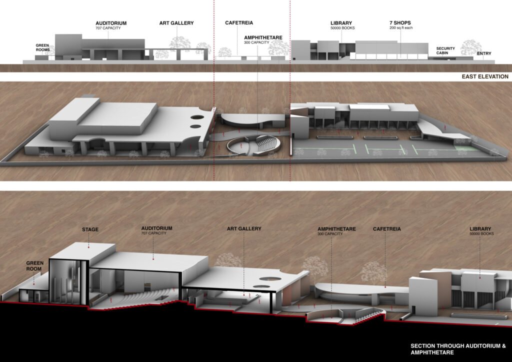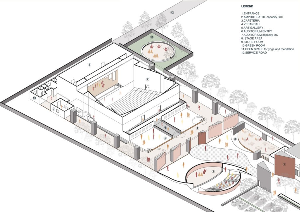 The experience begins at the first court, which opens into the library and shopping complex. This zone serves as the public face of the institution, inviting visitors into a vibrant cultural environment where knowledge, interaction, and everyday activity come together. Proceeding further along the axis, the second court unfolds into the amphitheatre and café. This intermediate space acts as a social and performative pause within the journey, encouraging gathering, conversation, and informal performances. The open-air setting creates an atmosphere of exchange and community, bridging the public realm with the more focused performance spaces beyond.