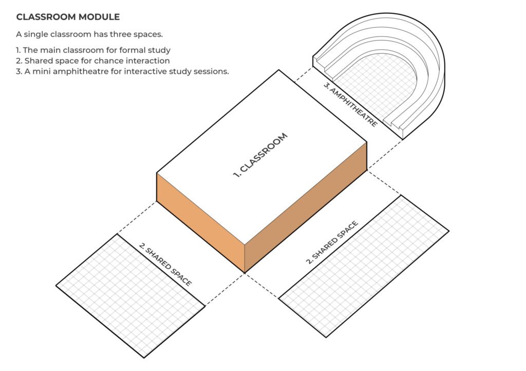 The single classroom is designed as a module that expands and opens out into an outdoor shared space for the spill-over activities of the class. It has three spaces.