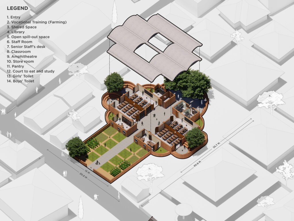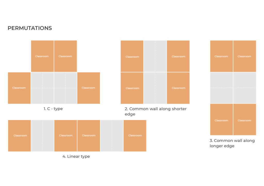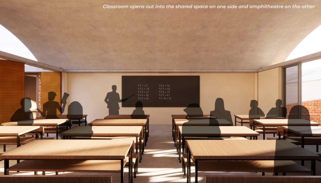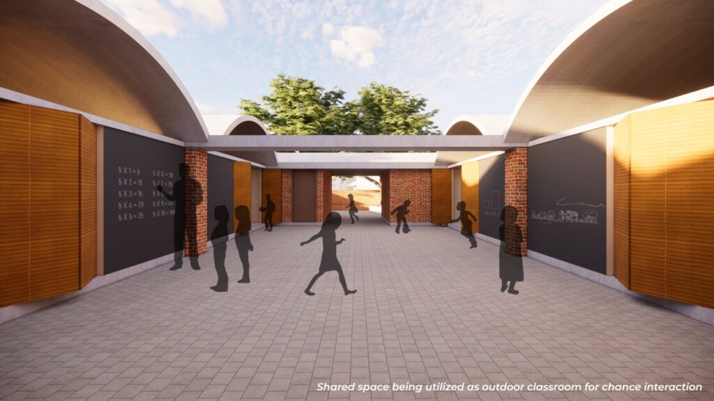 The primary school is designed as a system of classrooms that are attached to shared spaces for overflow activities of the class. The shared spaces between two classrooms form a third outdoor classroom for chance interaction between the teacher and the students. This system of classrooms has many permutations. The permutation that we selected ensures sharing of classrooms across the wall as well as through shared spaces. This transforms the four classrooms and the shared space into one big multipurpose space for school gatherings or events, and during calamities.