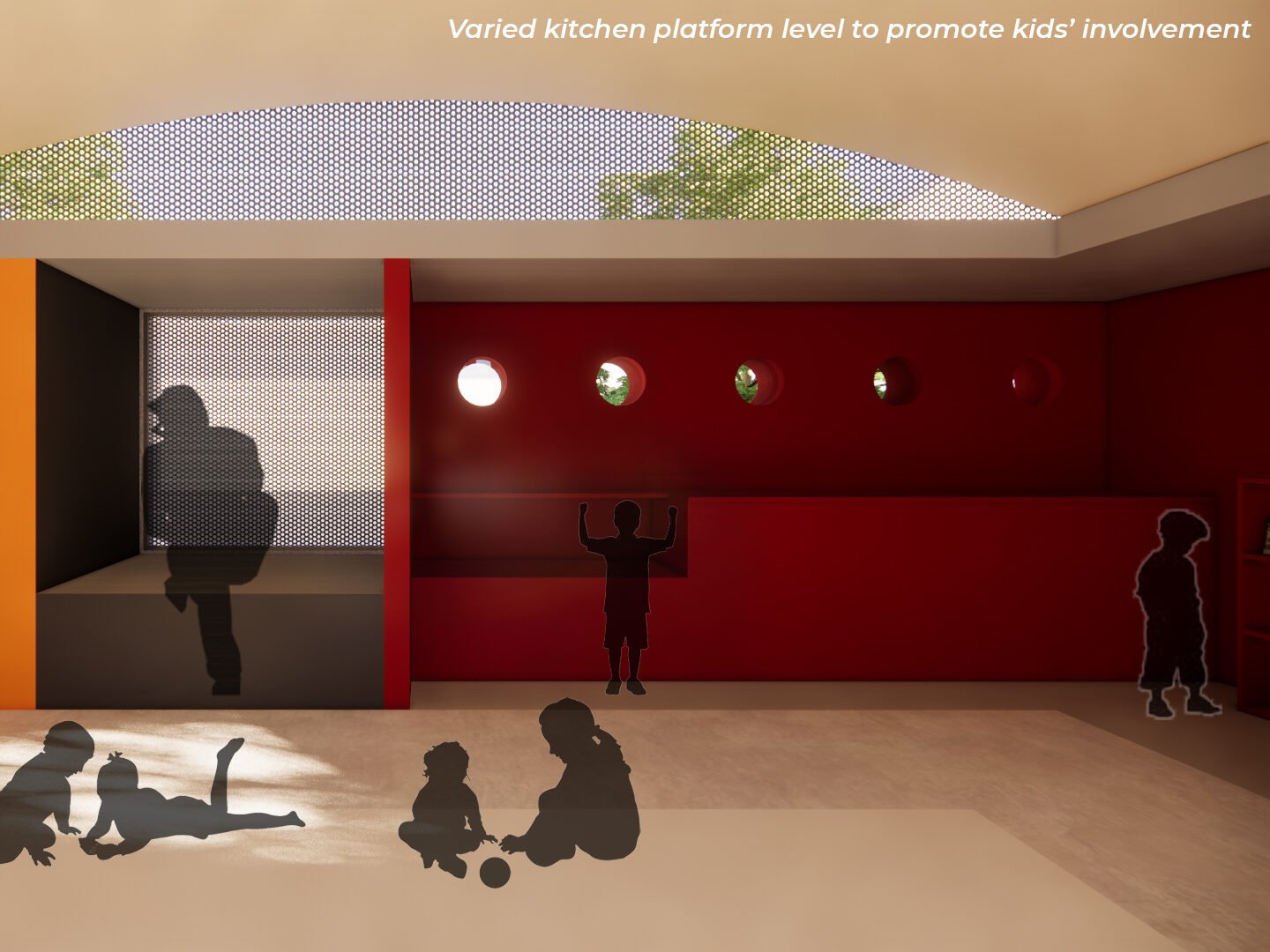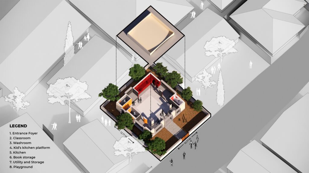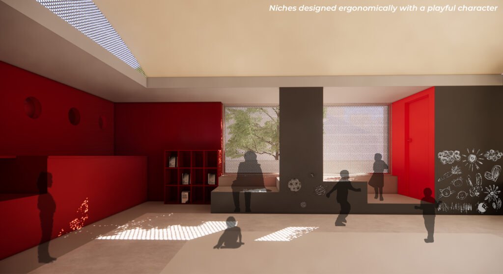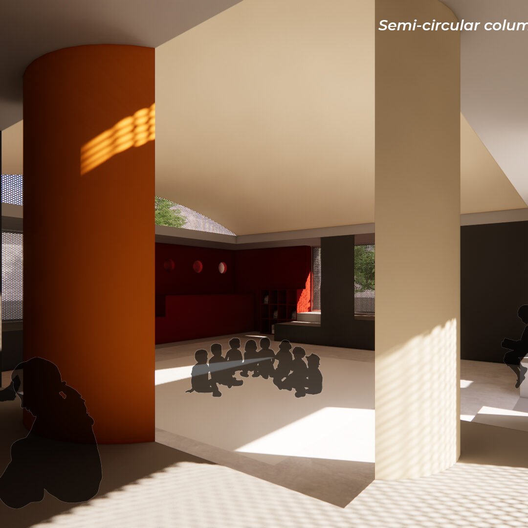 The Anganwadi is designed as an enclosed box with a 0.9m-wide layer surrounding it that hosts service activities (kitchen and toilets) and platforms for children to play, draw, and create. The Anganwadi measures 7.25m x 7.25m, the 0.9m layer is an interface between the indoor and outdoor spaces that ensures safety for kids and controls the passive lighting and ventilation to the main classroom.