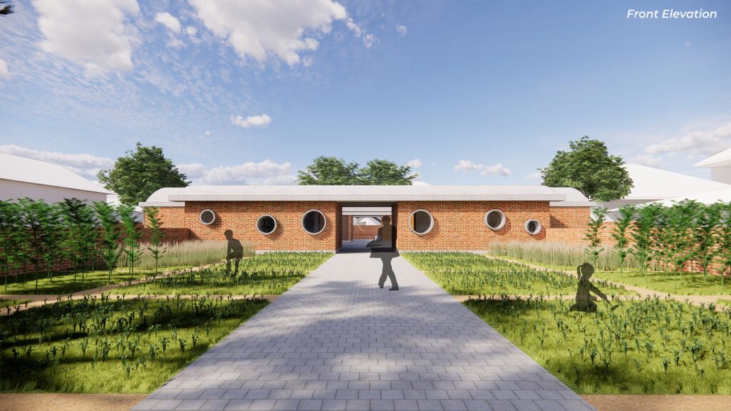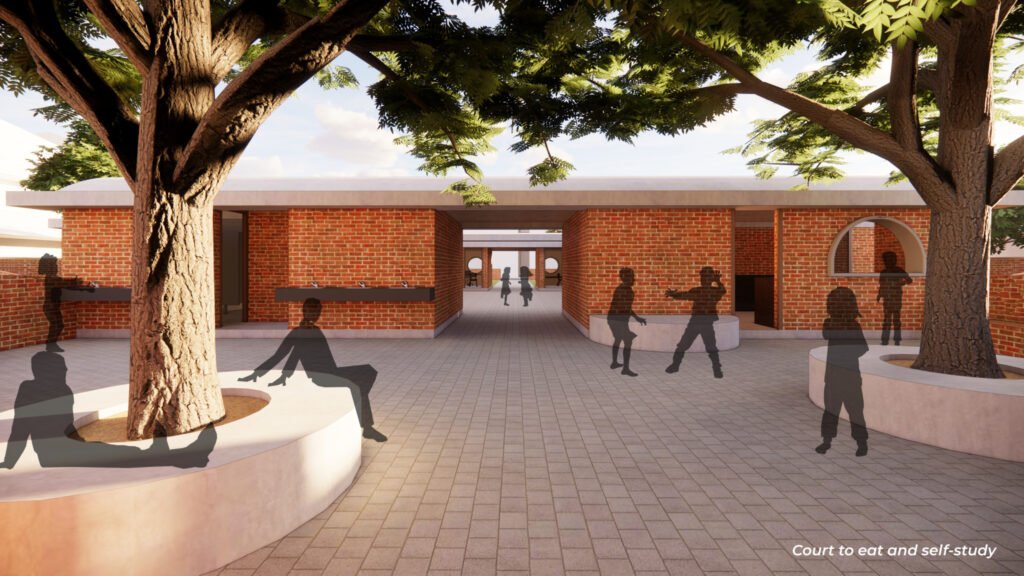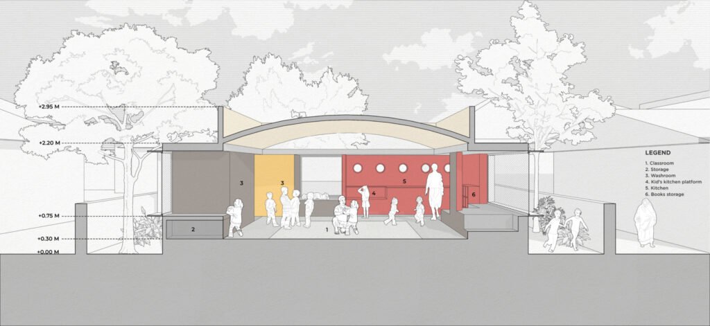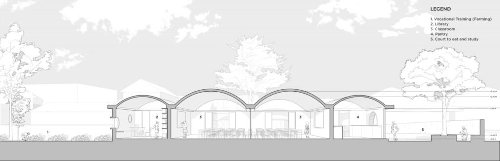 The library and staff room form the facade of the school through which students and teachers enter the campus. The pantry and toilet are to the rear, attached with a semi-circular court that holds the students when food is served. During other times, the rear court functions as a space for group activities and self-study.