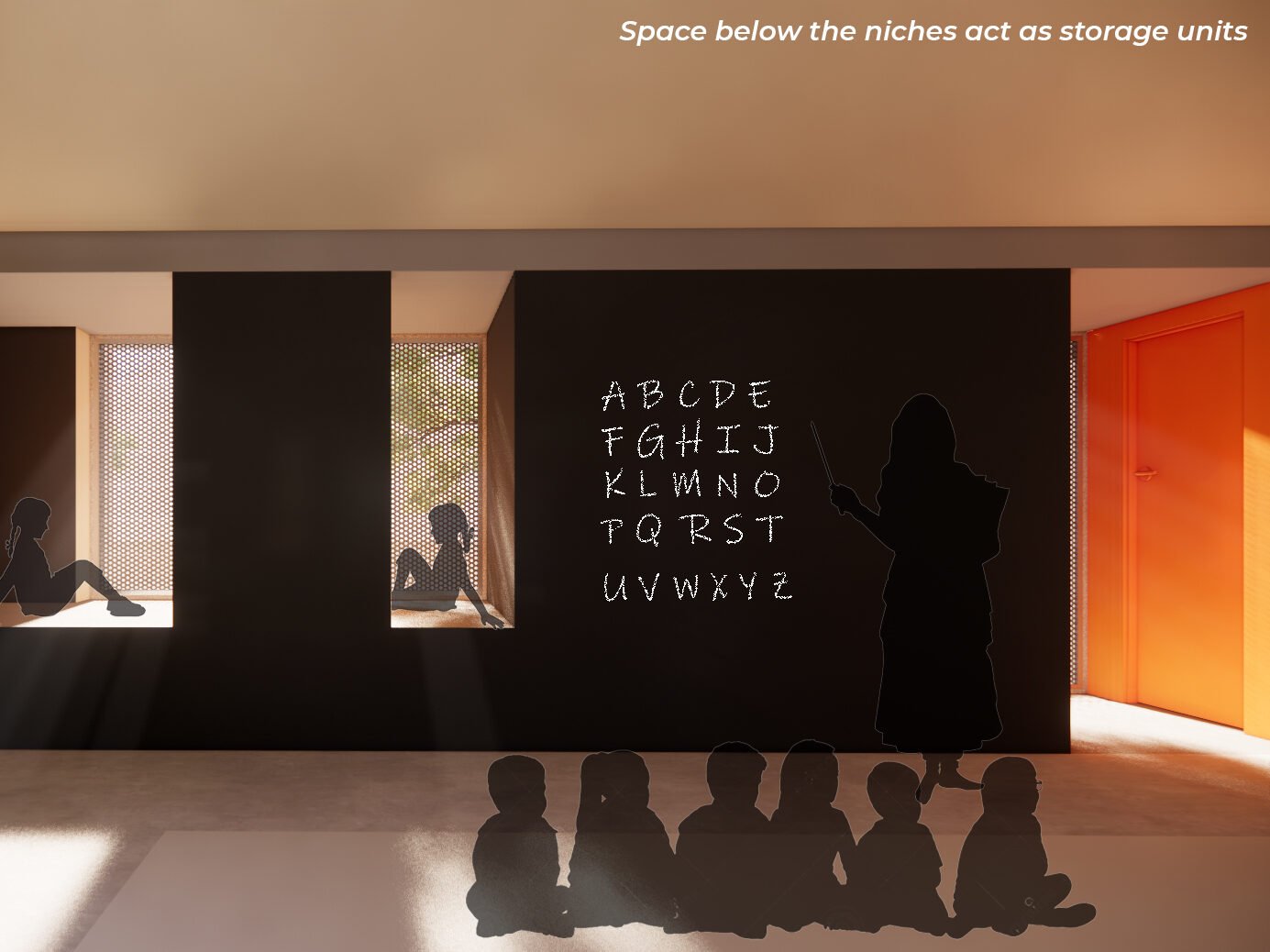 The main classroom measuring 4.85m x 4.85m functions as a congregation space for kids to study and interact, and the platforms on the edge allow for small group interactions or self-learning activities. The inner surfaces of the Anganwadi are painted in blackboard paint that can be used by teachers and kids to draw and write.