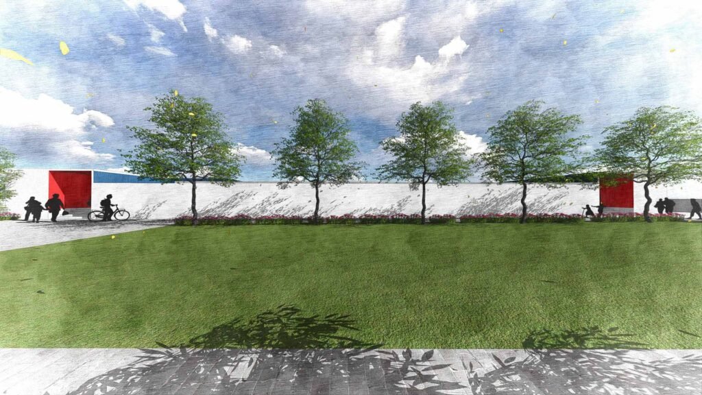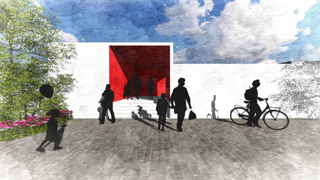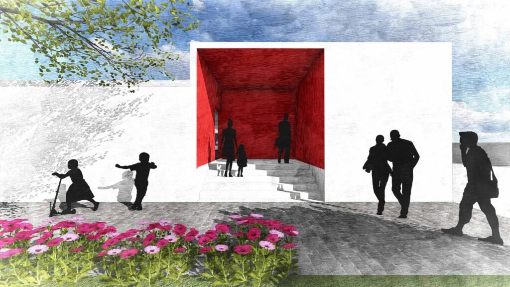The Blue Pool at Malkapur is conceived as an immersive spatial experience where architecture and atmosphere dissolve into one another. The complex is organized around two distinct entry points, both clearly articulated through red feature walls that act as visual markers and wayfinding anchors. These red thresholds create a bold contrast against the otherwise cool-toned palette, making the entrances instantly legible.