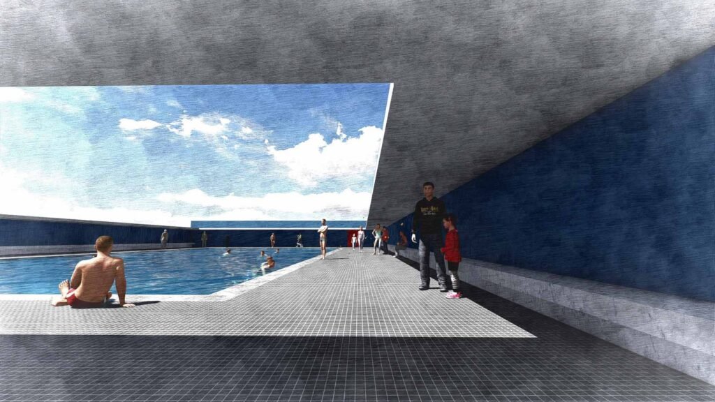 This chromatic strategy creates a space that feels fluid and atmospheric, where built form becomes an extension of the elements it houses. The blue surfaces not only reinforce the identity of the pool complex but also evoke a sense of calm, openness, and continuity between architecture, sky, and water.