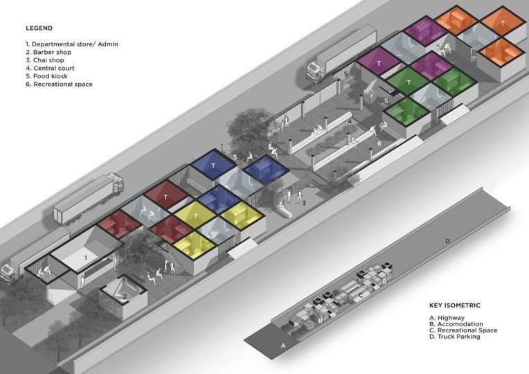 Transient Housing is conceived as a restorative refuge for the truck drivers’ community, a place that offers the comfort and familiarity of home when they are far from their own. Designed as a space for rest, rejuvenation, and recreation, the project responds to the unique rhythms of a life spent in transit. It seeks to create an environment where drivers can pause, recover, and reconnect before continuing their journeys.