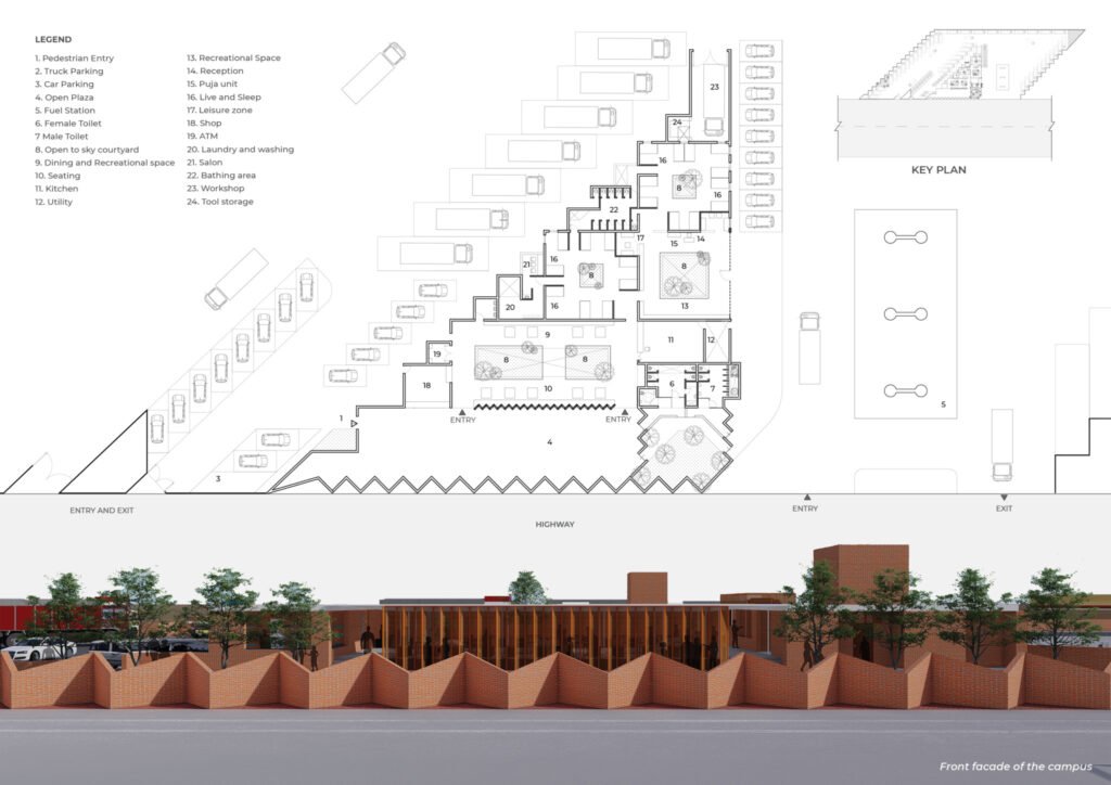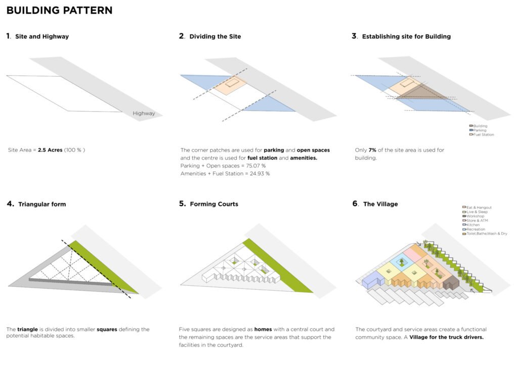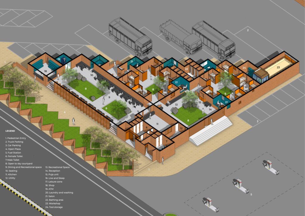 The Truck Drivers Village is a campus that hosts an array of facilities that serve long-distance truck drivers. The cluster has several access points, defining separate facilities for separate user groups. The project sits on a 2.5-acre site out of which the building occupies 7% of the site area, and the remaining area is open space, parking, and a fuel station.