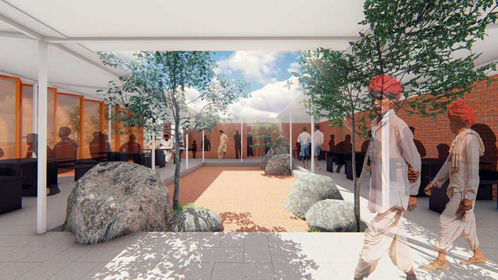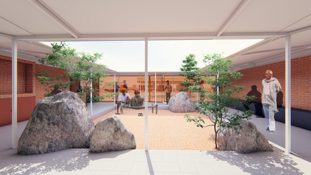 The landscape of the courtyard is designed with huge boulders and discrete vegetation to create a microclimate and to reference the landscape of Chitradurga.