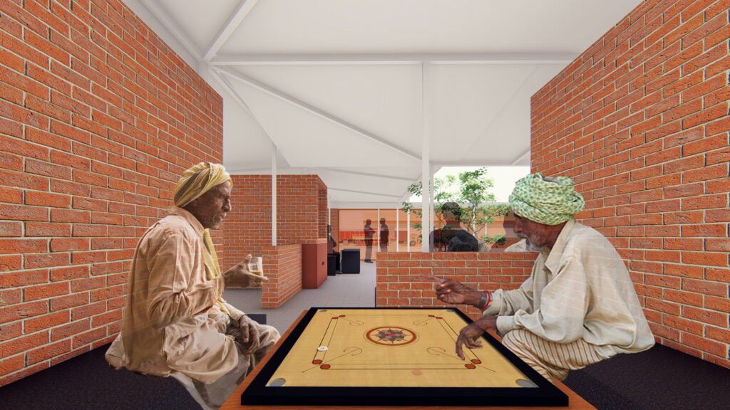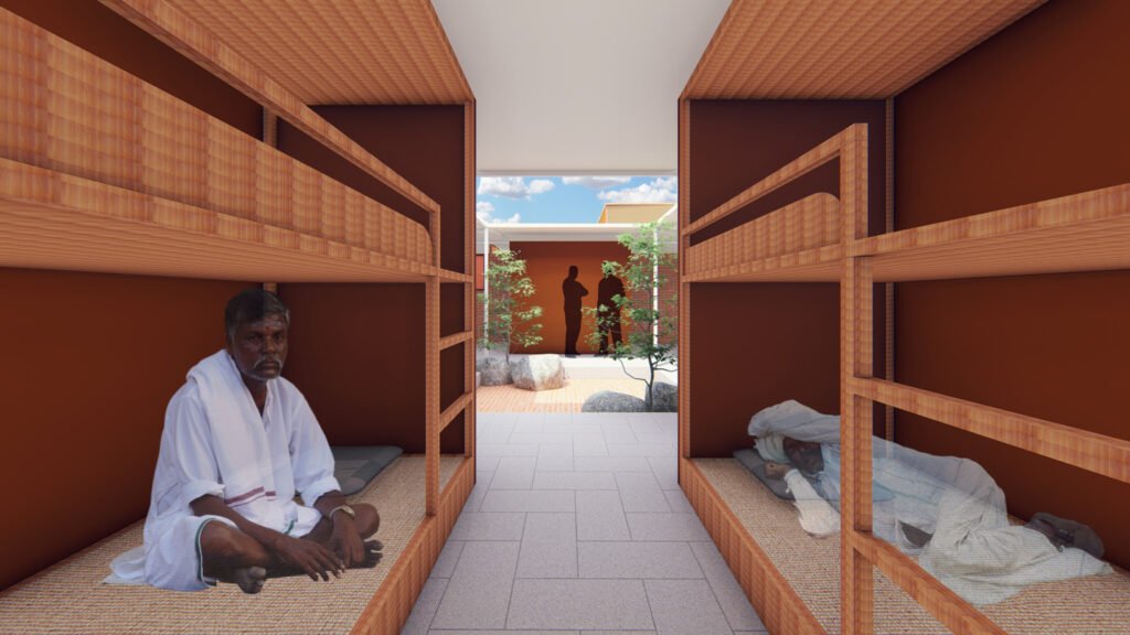 The village is designed as a series of courts and verandas. The courtyards are equipped with community activities like eating, sleeping, entertainment, and recreation. The community activities are supported with ATM, first aid, drinking water, toilets and bathing facilities, washing and drying clothes, a salon, a convenience store, and a workshop for trucks.