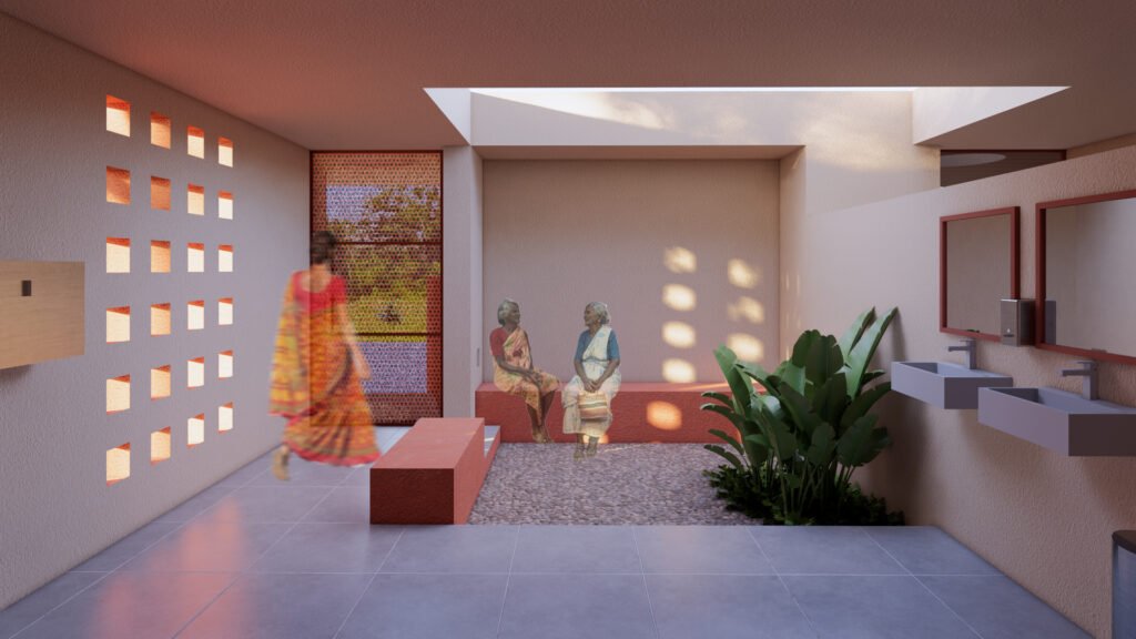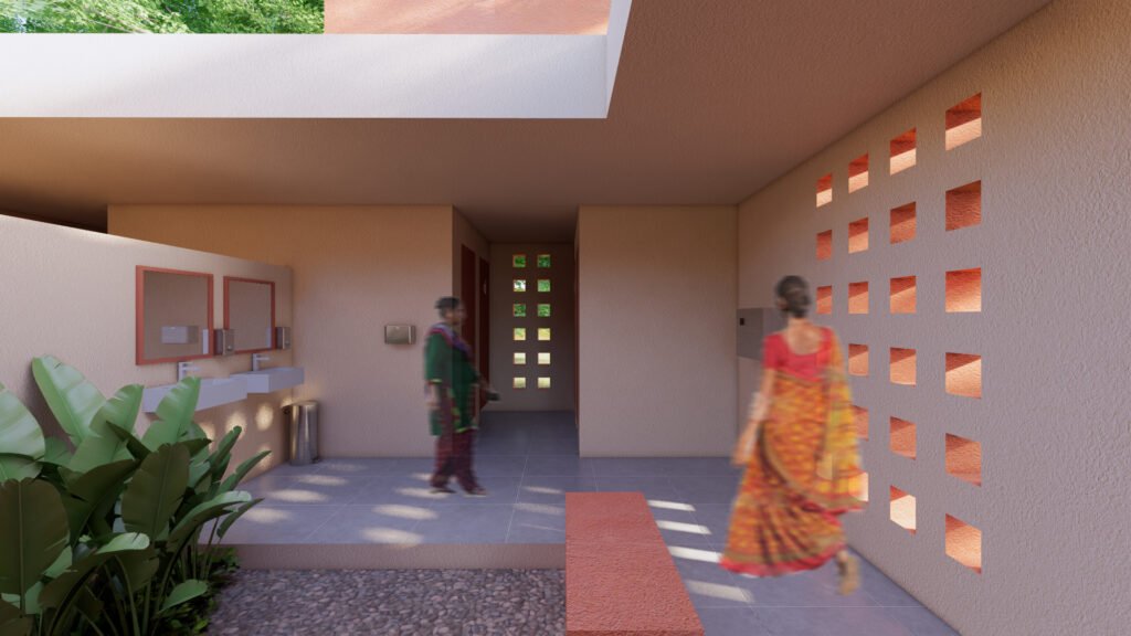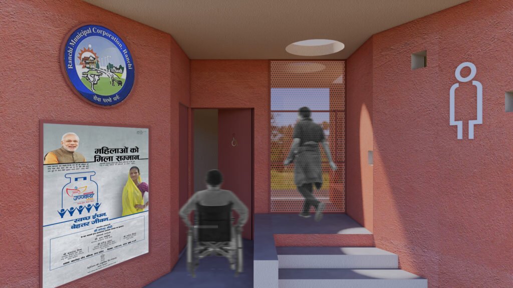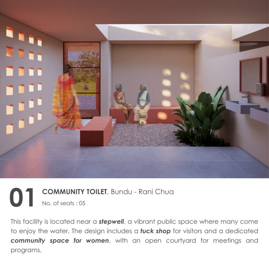 This community toilet facility is located near a stepwell, a vibrant public space where many people come to enjoy the water. The design includes a tuck shop for visitors and features a dedicated community space for women, with an open courtyard for meetings and programs. The overall design is open and airy, with green spaces that create a courtyard-like feel. The courtyards within the facility also serve as pause points and spaces for relaxation. Chamfered entrances offer a welcoming approach, while clear signage throughout ensures easy navigation. The color palette of beige and a sandstone-red hue is inspired by the local context of Bundu, blending seamlessly with the surroundings.