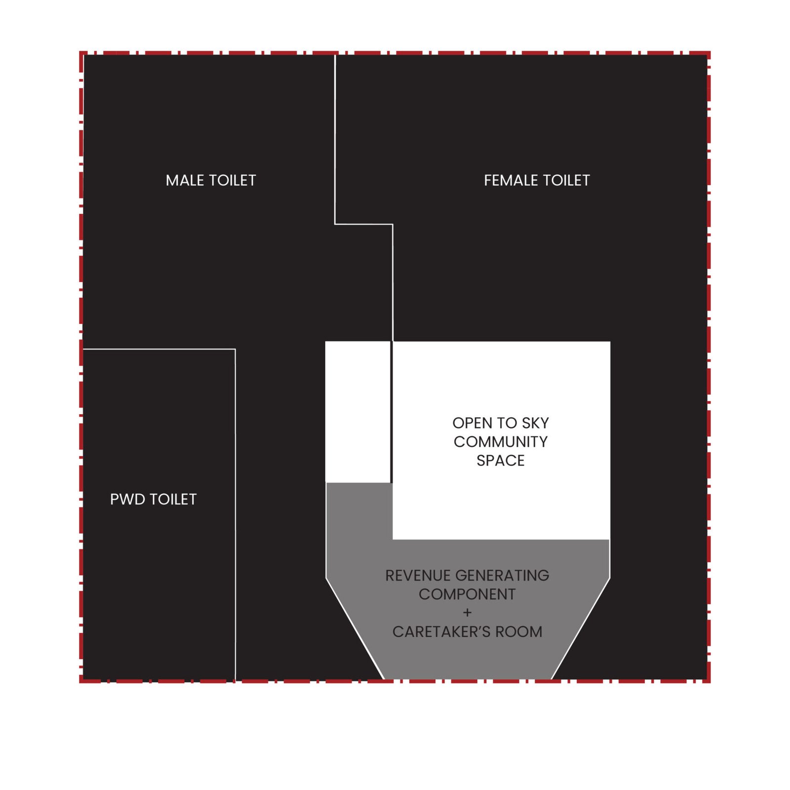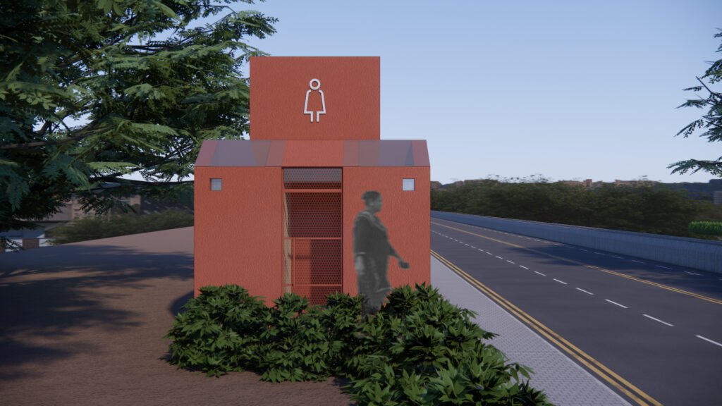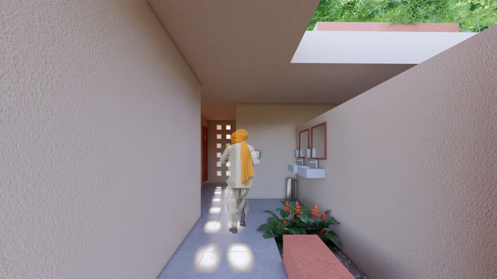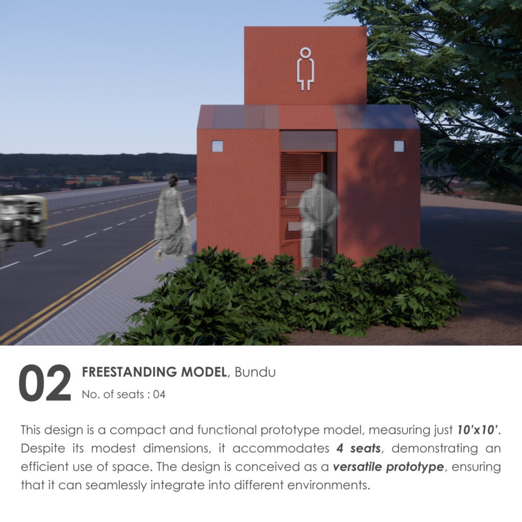 This community toilet facility is located near a stepwell, a vibrant public space where many people come to enjoy the water. The design includes a tuck shop for visitors and features a dedicated community space for women, with an open courtyard for meetings and programs. The overall design is open and airy, with green spaces that create a courtyard-like feel. The courtyards within the facility also serve as pause points and spaces for relaxation. Chamfered entrances offer a welcoming approach, while clear signage throughout ensures easy navigation. The color palette of beige and a sandstone-red hue is inspired by the local context of Bundu, blending seamlessly with the surroundings.